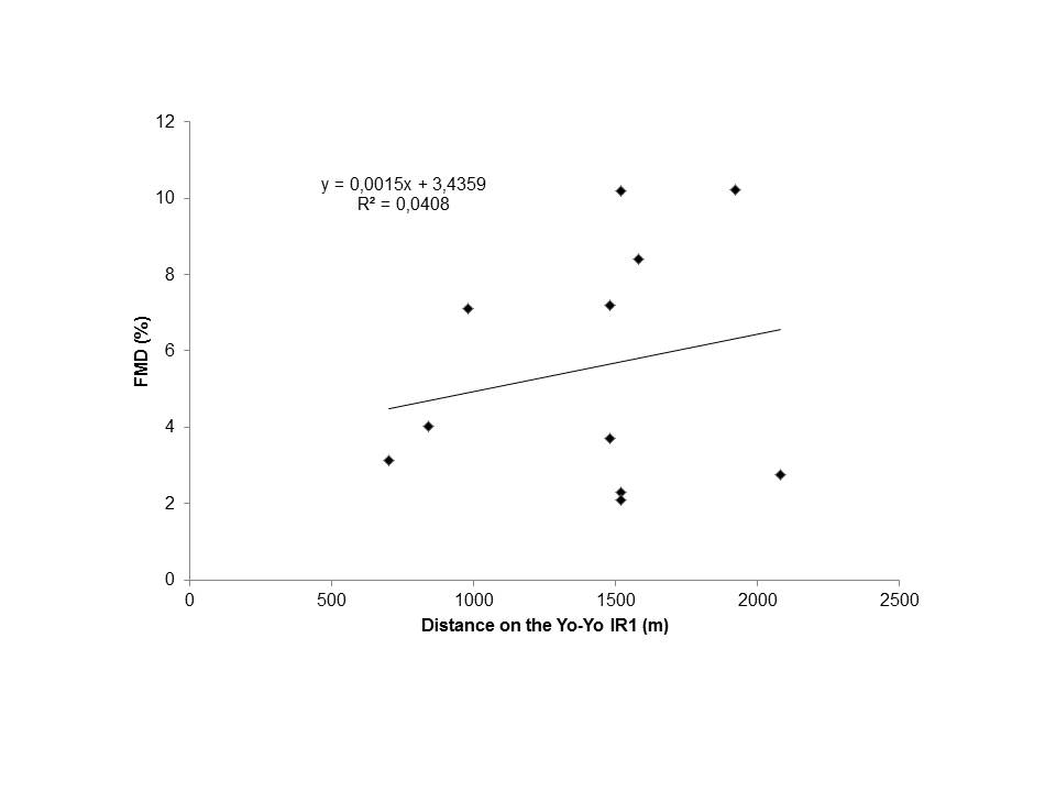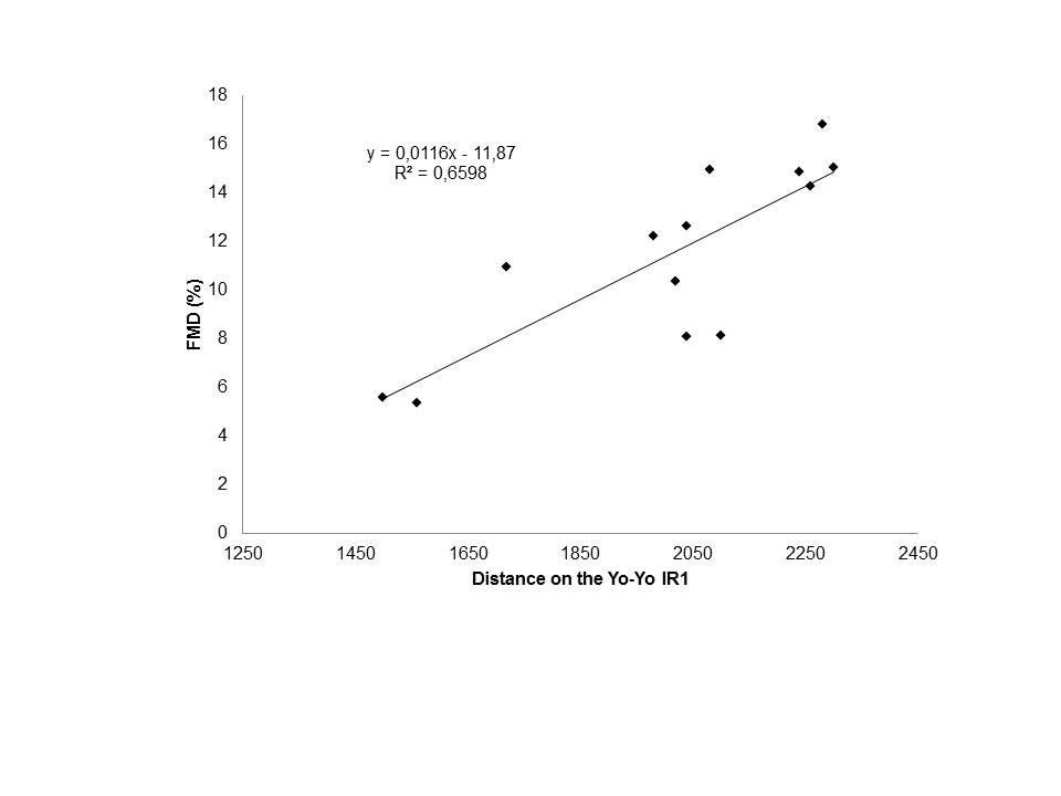 O Yo-Yo Intermittent Recovery Test avalia a capacidade individual para realizar exercício intermitente levando a uma ativação máxima do sistema aeróbio. Também foi demonstrado que o exercício aeróbio melhora a função endothelial (FMD). Além disso, estudos indicam que existe uma associação positiva entre a FMD e o consume máximo de oxigênio, mas não há dados disponíveis sobre a associação com o Yo-Yo Intermittent Recovery Test. Assim, o objetivo do presente estudo foi investigar, em jovens jogadores de futebol, se o Yo-Yo Intermittent Recovery Test nível 1 poderia também estar associado à FMD. Treze jovens jogadores de futebol (atletas) e onze jovens não-atletas (controle) participaram deste estudo. A FMD e o Yo-Yo Intermittent Recovery Test nível 1 foram medidos em cada grupo. A FMD e a distância no Yo-Yo Intermittent Recovery Test nível 1 foram significativamente maiores (p <0,002 e p <0,001, respectivamente) nos atletas (FMD = 11,5 ± 3,8; Yo-YoIR1 = 2009,2 ± 263,8) que no grupo controle (FMD = 4,9 ± 5,4, Yo-YoIR1 = 1420 ± 423,8). A correlação de Pearson entre a FMD e a distância no Yo-Yo Intermittent Recovery Test nível 1 no grupo atletas foi r = 0,81 (p <0,005), enquanto no grupo controle foi r = 0,03 (p <0,005). Nossos resultados indicam que há uma associação positiva entre o Yo-Yo Intermittent Recovery Test nível 1 e a FMD em jovens jogadores de futebol. Esta associação fortalece o Yo-Yo Intermittent Recovery Test nível 1 como uma ferramenta eficaz na avaliação do desempenho de atletas de esportes intermitentes.
